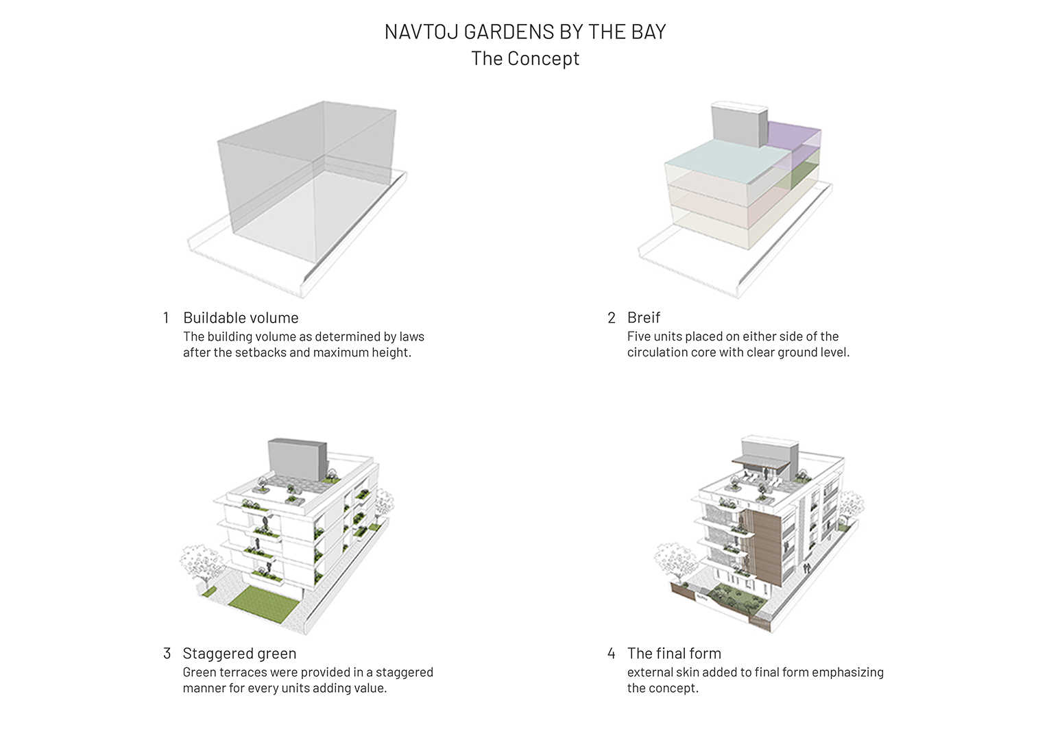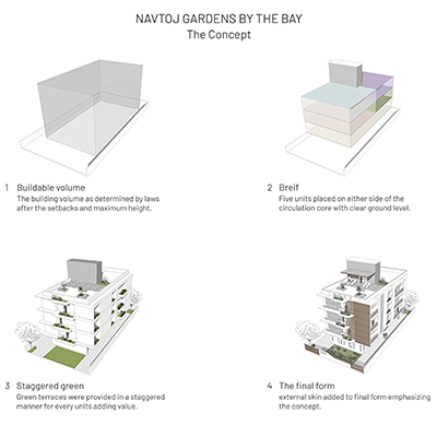 The brief was to design a single ultra-luxury apartment in each floor amidst the selected uber-posh residential locality of the city. Maximum space utilisation with best possible lighting and ventilation were prioritised for every space. Each 4-bedroom apartment is around 3,000 SQ. FT with a cantilevered planter area the extends from the living room. The planter is stacked up vertically in a staggered pattern to create an embellished front end for building. Privacy and a greenery are distinct features of these apartment that subsequently relates to feeling called home. This can be perceived through the innovative adaptations of the interiors by the residents that ultimately contributes to the design, translating it into a successful project.