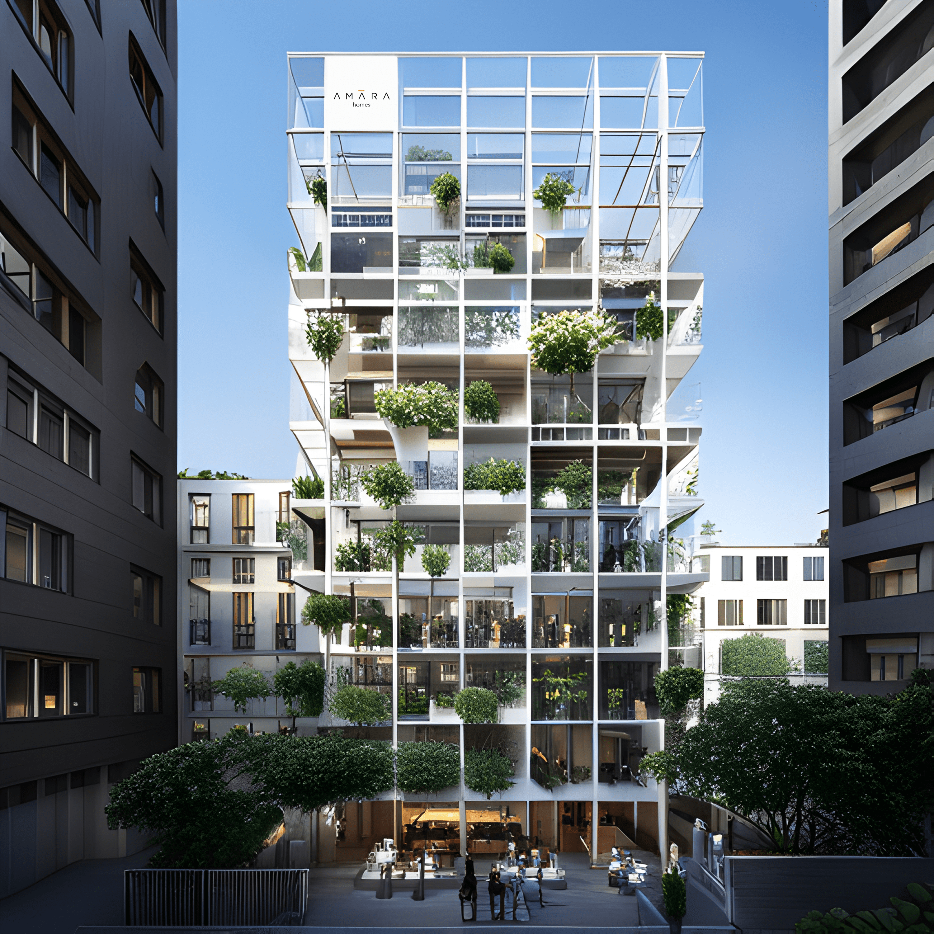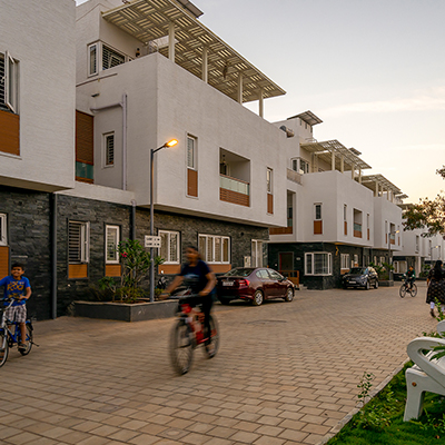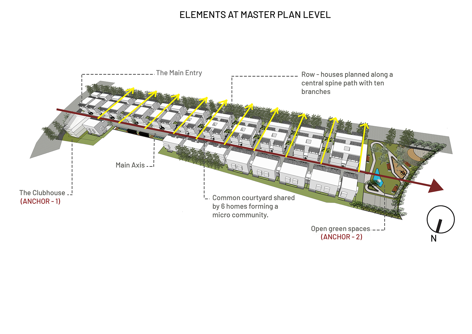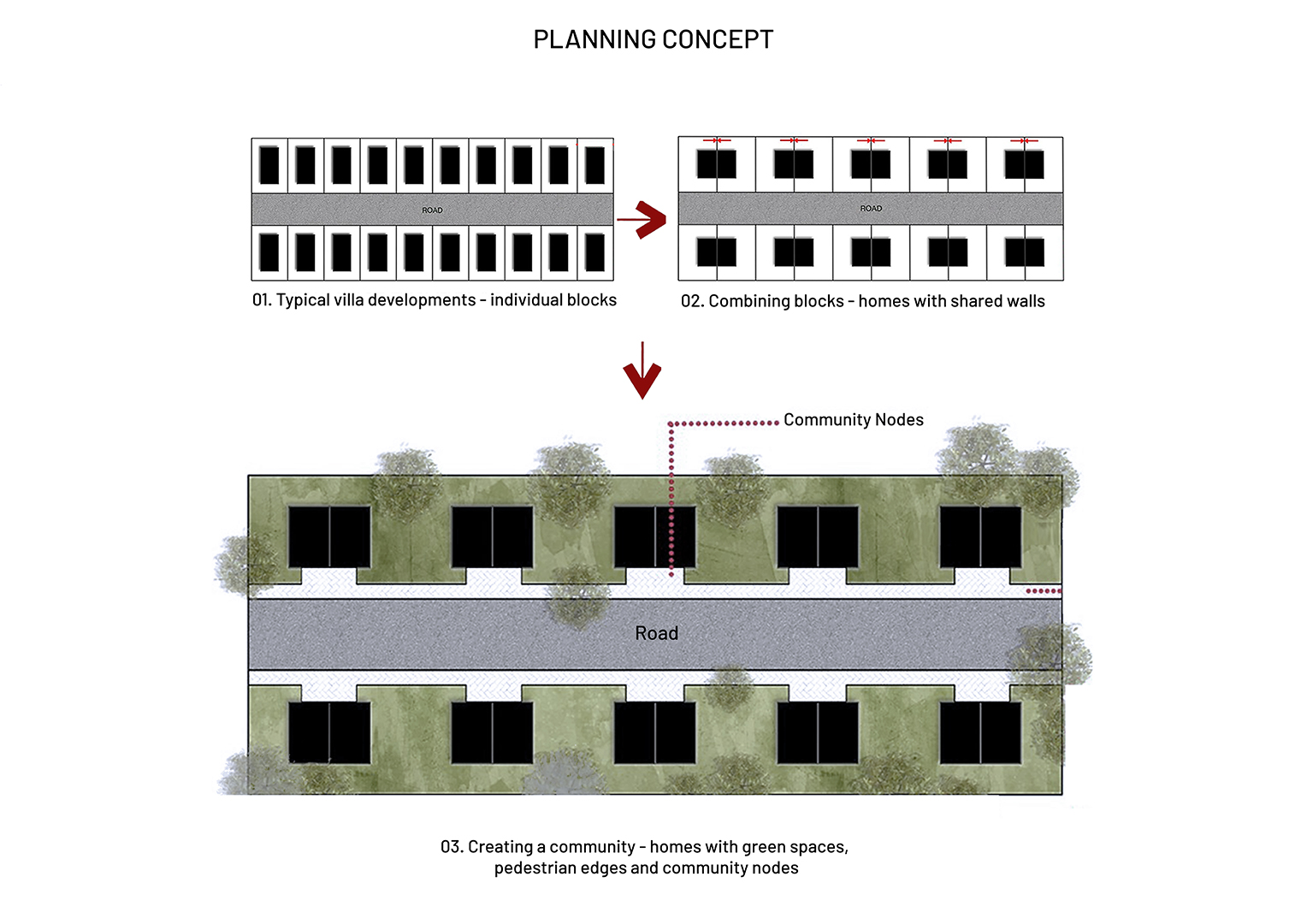 The aim was to create a social, climate friendly neighbourhood that consist of houses with green pockets, pedestrian walkways and community connections. Zoning involved retaining the existing green cover adhering to the micro context. The central access way as spine in east west direction limits the solar exposure and the branching narrow pedestrian streets between the units reduce the effects of local heat island. Green bridges were introduced as canopy across the streets that enables a sense of enclosure for societal interaction. Outdoor seating areas were provided to increase the community cohesion at a larger level that further indirectly binds the community and its safety.